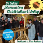 Donnerstag, 18.12.2025 | 19:00 Uhr | Treffpunkt: Altes Rathaus, Erding Zum Jahresende lädt der Ortsverband Erding von BÜNDNIS 90/DIE GRÜNEN herzlich ein zum gemeinsamen Besuch des Christkindlmarkts in der Erdinger Innenstadt. 🎄 Bei einem wärmenden Glühwein oder Punsch möchten wir gemeinsam mit euch das politische Jahr 2025 ausklingen lassen. Es ist eine… 🌟 Jahresausklang mit dem OV Erding auf dem Christkindlmarkt weiterlesen