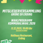 Der Ortsverband Erding von BÜNDNIS 90/DIE GRÜNEN lädt alle Mitglieder herzlich zur nächsten Mitgliederversammlung ein: 📅 Donnerstag, 11. Dezember 2025📍 Vollhaus Restaurant, Am Weiher 16, 85435 Erding🕡 Eintreffen ab 18:30 Uhr🕖 Beginn der Versammlung: 19:00 Uhr Im Mittelpunkt des Abends steht die Verabschiedung des Wahlprogramms für die Stadtratswahl 2026. Gemeinsam wollen wir die… Mitgliederversammlung OV Erding – Wahlprogramm Stadtratswahl weiterlesen