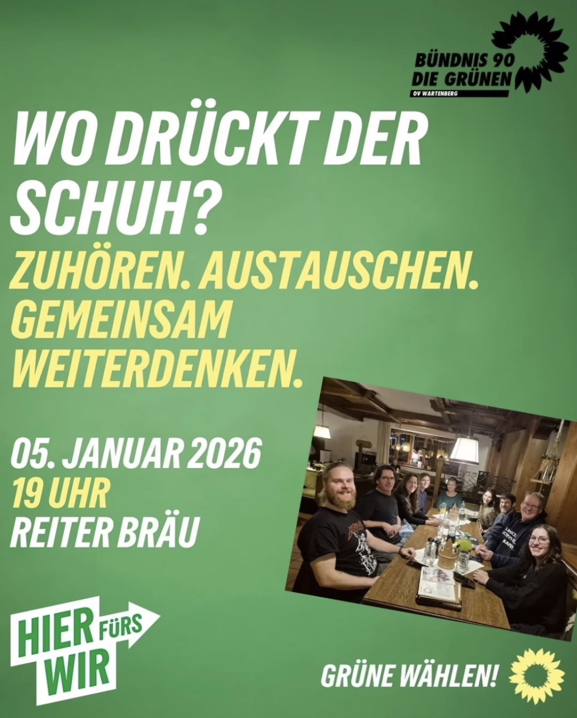 Der Ortsverband Wartenberg von BÜNDNIS 90/DIE GRÜNEN lädt herzlich ein zu einem offenen Austauschabend unter dem Motto „Wo drückt der Schuh?“ am Montag, den 05. Januar 2026 um 19:00 Uhr im Reiter Bräu in Wartenberg.